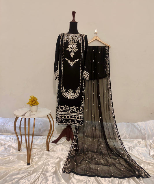FARI Heavy sequence Luxury chiffon Embroidered womenswear 3 piece ready to wear suit (Black)
