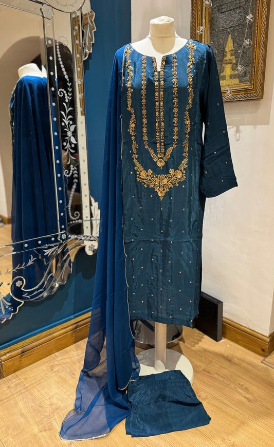 Bluey Silk 3 piece ready to wear traditional handwork stylish womenswear outfit