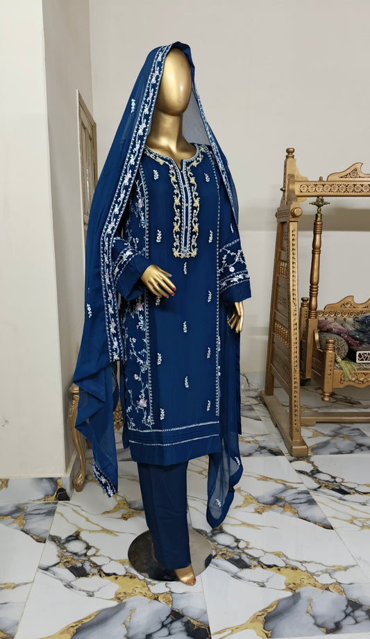 BLUE Noor Luxury Chiffon Pret embroidered 3 piece traditional long short suit